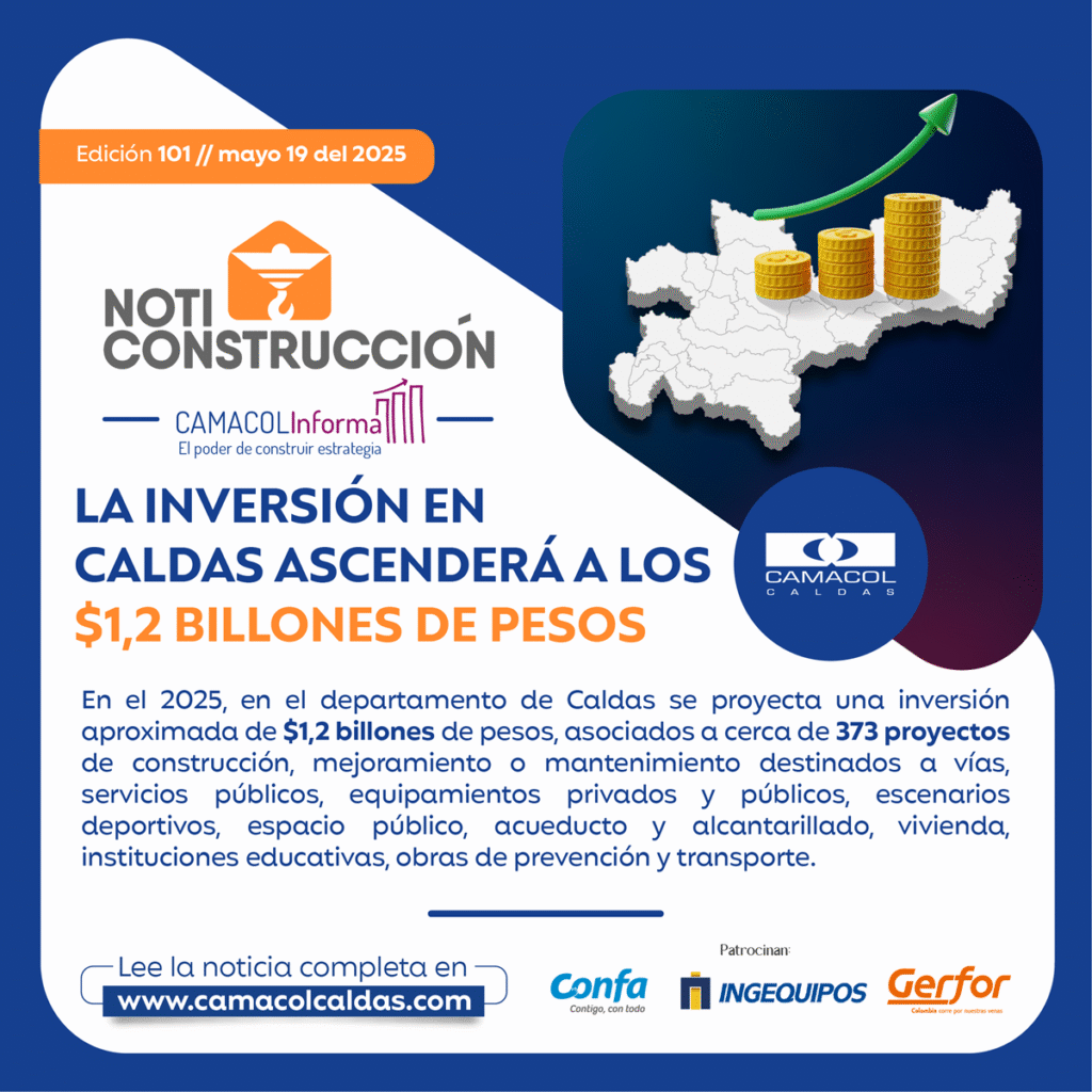 En el 2025, en el departamento de Caldas se proyecta una inversión aproximada de $1,2 billones de pesos, asociados a cerca de 373 proyectos de construcción, mejoramiento o mantenimiento destinados a vías, servicios públicos, equipamientos privados y públicos, escenarios deportivos, espacio público, acueducto y alcantarillado, vivienda, instituciones educativas, obras de prevención y transporte.